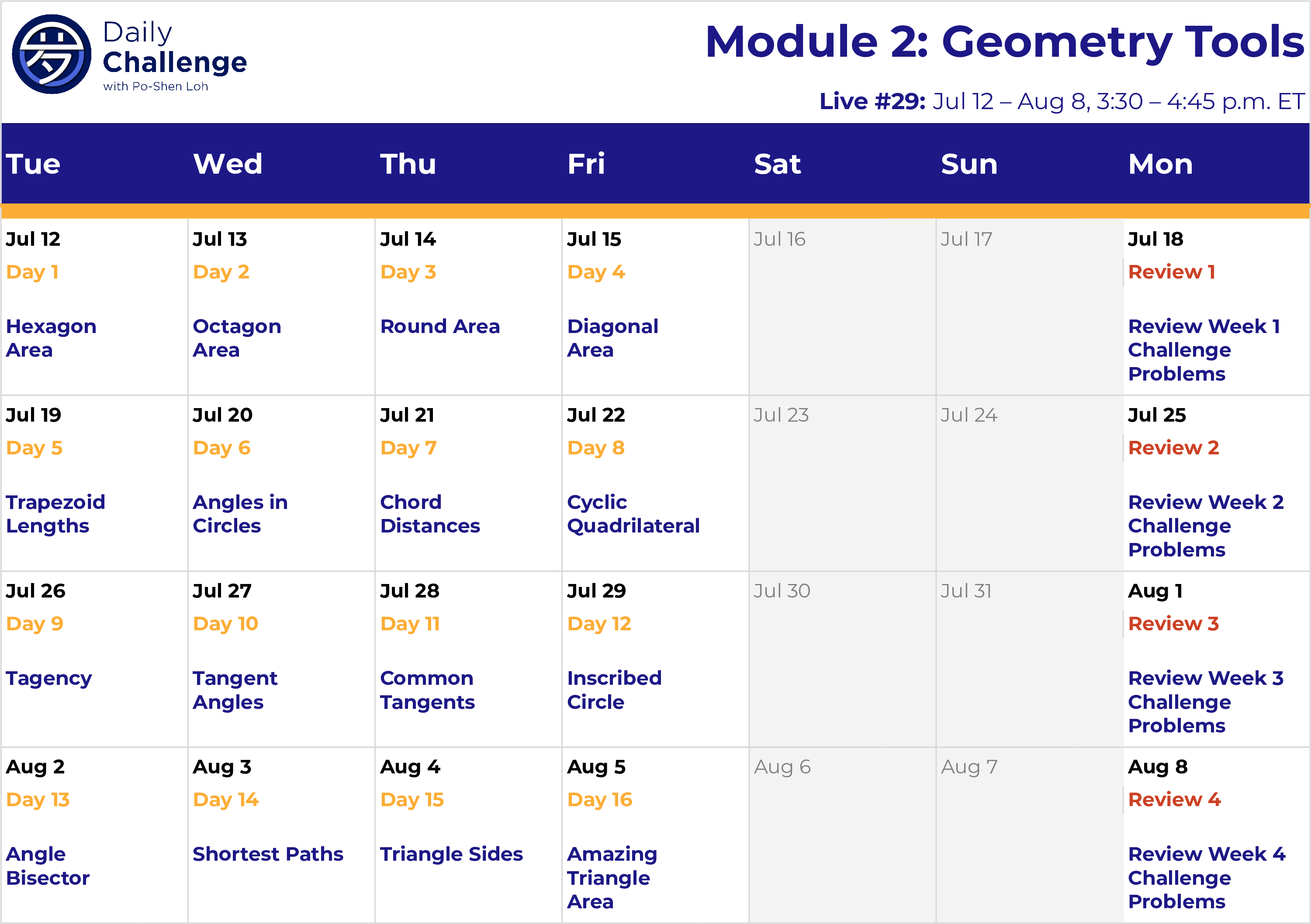 This course rapidly teaches geometrical concepts through custom-designed problems that are understandable to students who have not yet taken a proof-based high school geometry course. It covers geometry which appears in MATHCOUNTS, AMC 8, and AMC 10.