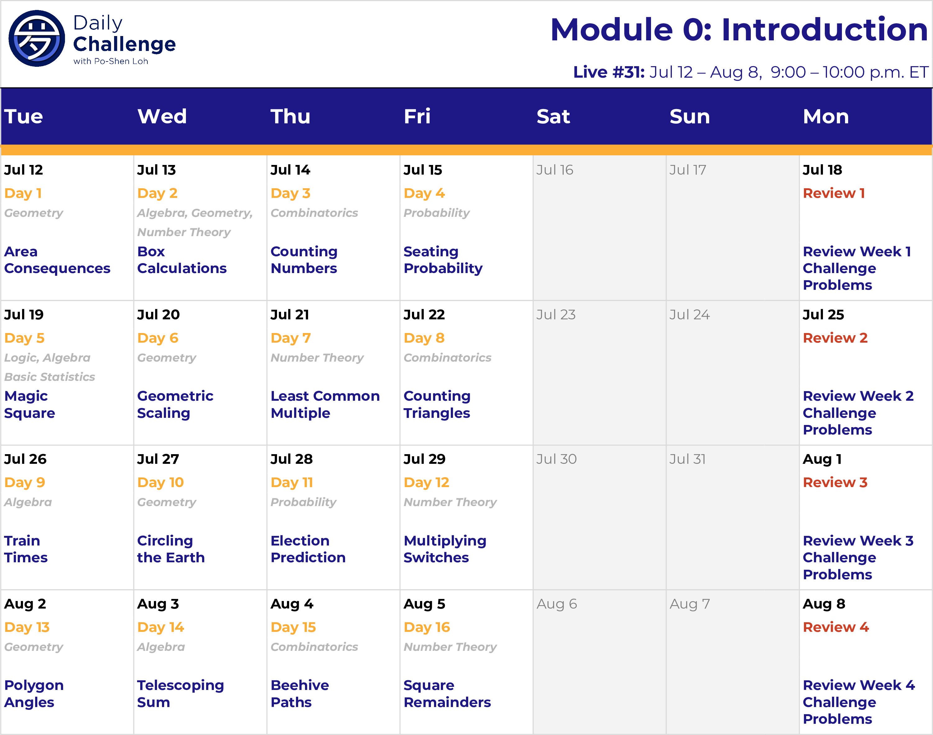 This course is an efficient whirlwind tour through all areas of beyond-curricular math (aligned with MATHCOUNTS and AMC 8). It is designed to inspire students to love challenging math.