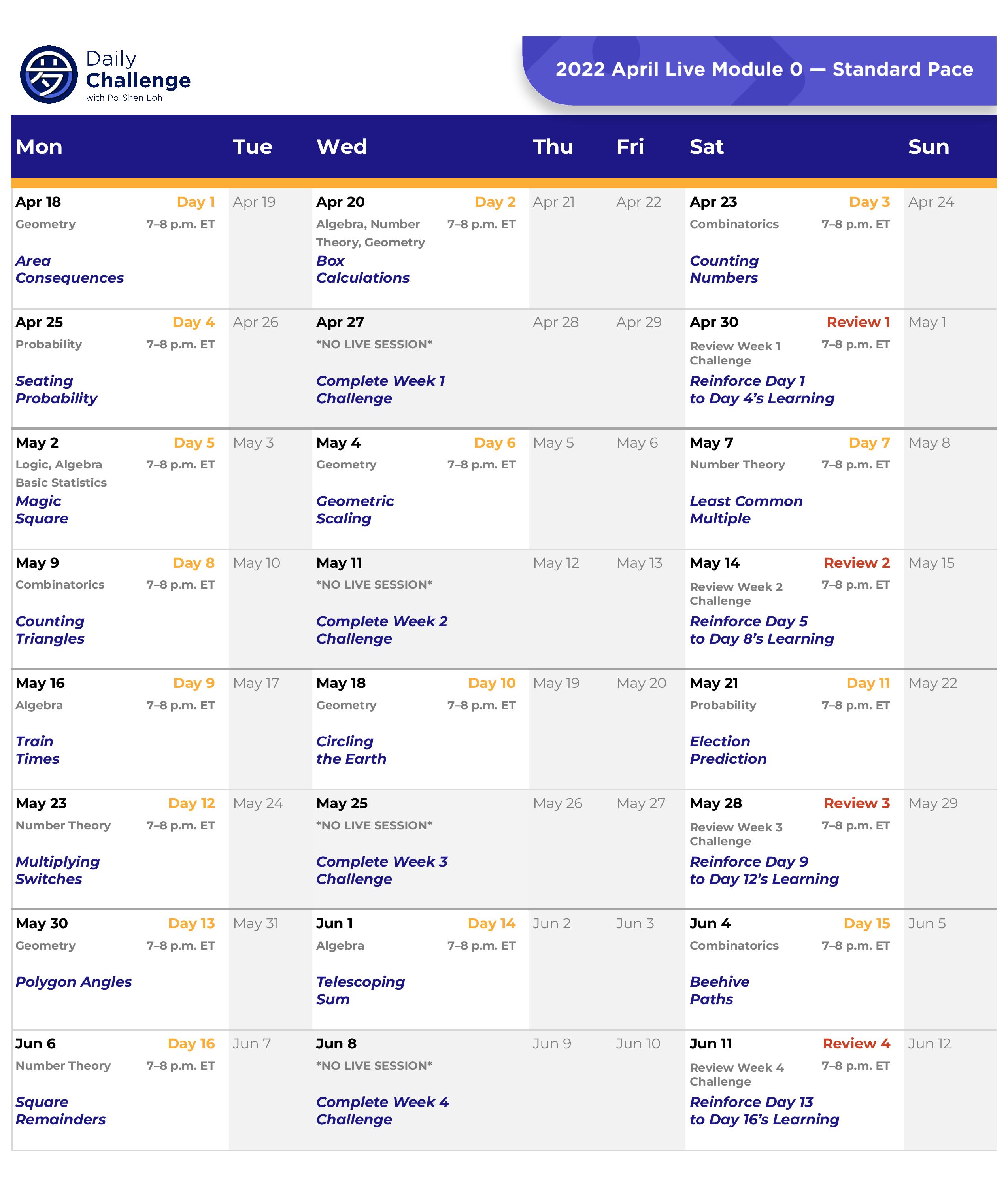 The school year is always so busy! The Standard Pace Live Module 0 course provides a manageable schedule for students not only interested in math but also busy with other activities.