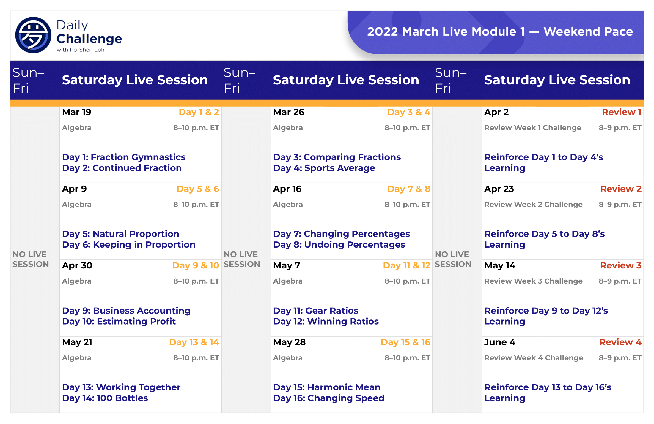 The 2022 Mar Weekend Pace Live Module 1 course features 20 hours of live sessions and 1-year access to the curriculum videos designed and pre-recorded by Prof. Loh.