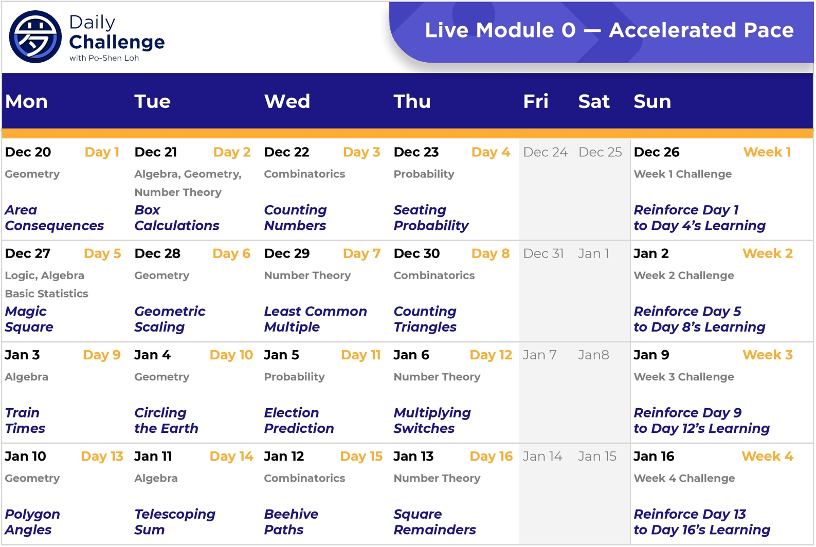 The Accelerated Pace course features 4 consecutive Live Sessions to ensure students go through 4 Day Challenges during the week, and a Live Review Session on Sunday to revisit the Weekly Challenge.